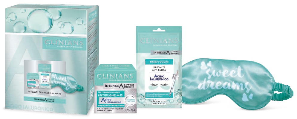 Il cofanetto Clinians Intense A Lifting Rughe Acido Ialuronico racchiude tre trattamenti distinti per rispondere alle esigenze quotidiane della pelle del viso e del contorno occhi. La crema viso Intense A Lifting Rughe Trattamento Giorno, in formato da 50 mL, è un trattamento rimpolpante che unisce booster di Acido Ialuronico e Collagene ad altri attivi cosmetici selezionati. La sua formula svolge un’azione volumizzante e ricompattante, aiutando a rimodellare i tratti del viso e conferendo un aspetto più levigato e fresco. I patch occhi in hydrogel sono un trattamento intensivo ad azione idratante e anti-fatica. La loro texture aderisce perfettamente alla pelle favorendo la penetrazione dei principi cosmetici presenti, regalando in soli 20 minuti uno sguardo riposato e luminoso. Sono ideali prima di un evento importante o semplicemente per concedersi un momento di benessere. Completano il cofanetto le maschere occhi per la notte Sweet Dreams, perfette per prendersi cura del contorno occhi durante il riposo notturno. La loro formulazione favorisce una sensazione di freschezza e comfort, contribuendo a donare al risveglio un aspetto più disteso e riposato. Questo cofanetto è pensato per chi desidera integrare nella propria beauty routine prodotti mirati e di qualità, unendo praticità ed efficacia in un’unica confezione regalo.