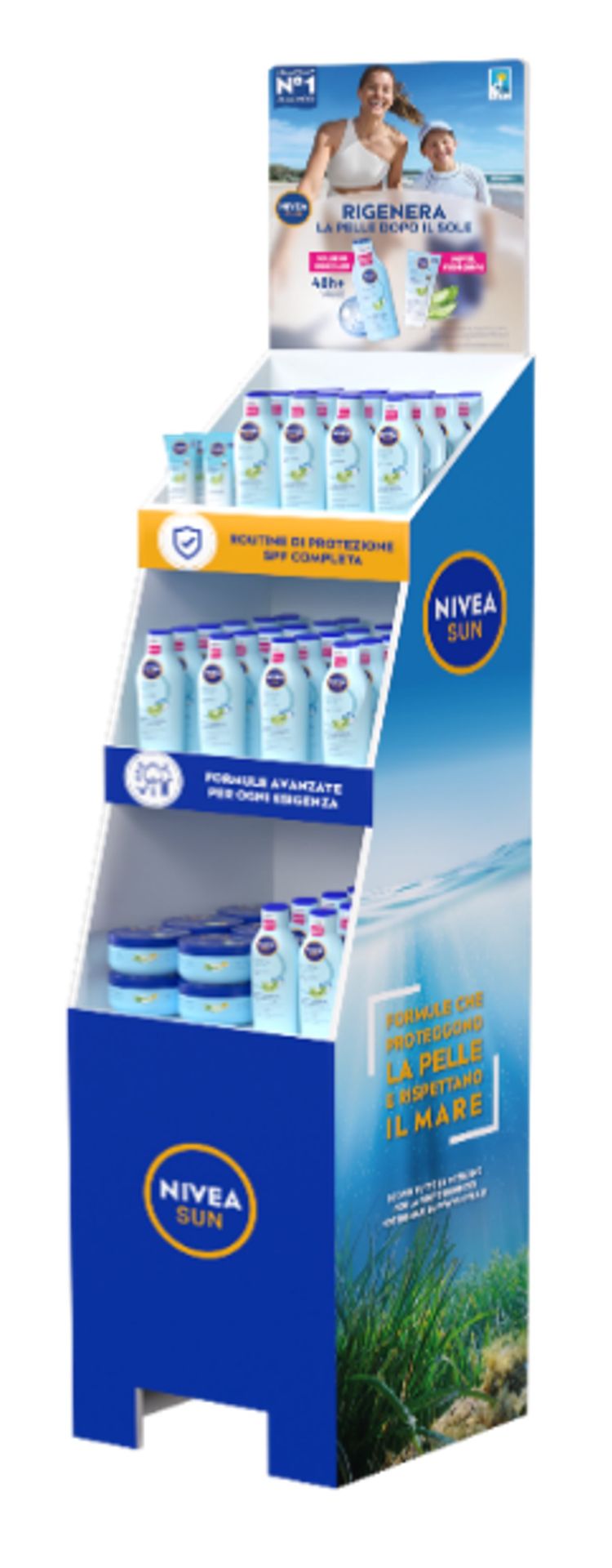 Nivea display of 66 pieces. In the display the after-sun sun line in moisturising and regenerating jar and tube format.
